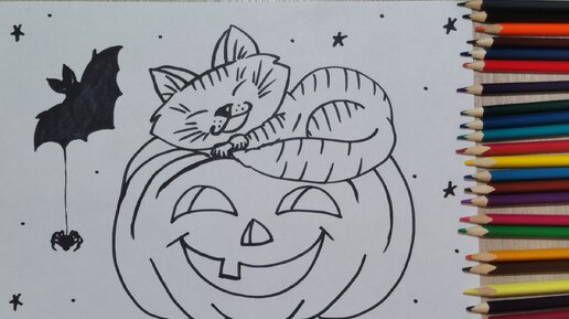 Рисунок на Хэллоуин. Кот спит на тыкве