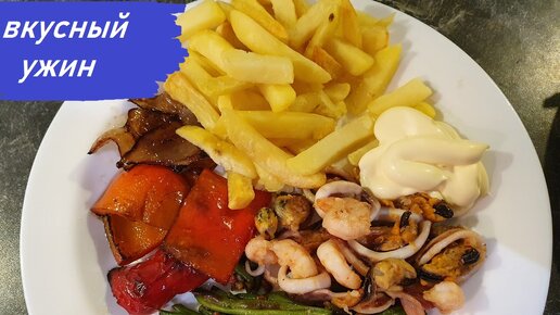 Ужин, овощи с морепродуктами и картошка фри на пару .Germany