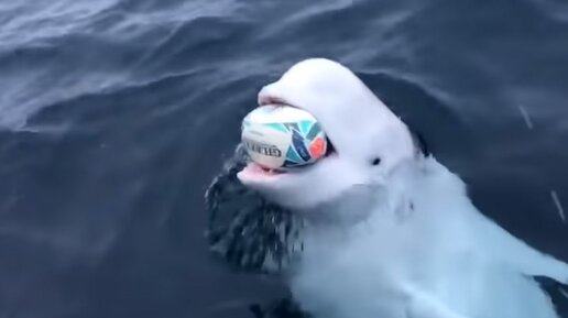 Белуга в океане играет с мячом, который ей бросают рыбаки