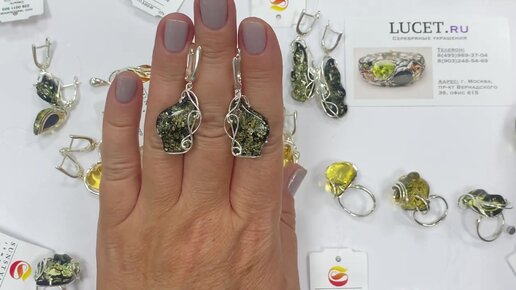Натуральный зеленый янтарь из Калиниграда. Крупные кольца, длинные серьги и кулоны из серебра 925