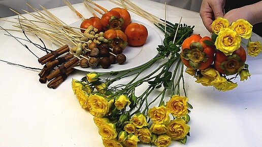 Собираем солнечный букет из роз, хурмы, орехов и корицы.