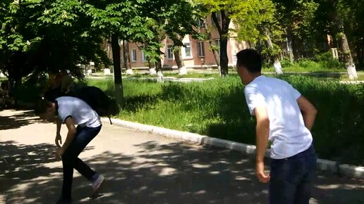Забросили портфель на каштан и пытаемся его сбить другим портфелем