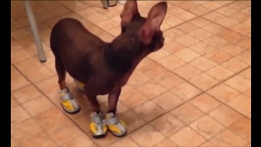 Чихуахуа надели кросовки. Не понимая, как в них ходить,пытается разобраться.