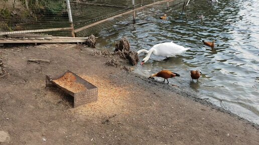 Показываю кормушку для лебеде и уток. И корми пеликана перцем
