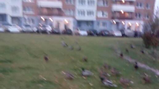 Дикие утки, поселилвшиеся в пруду около высотки гуляют по травке. Мы их кормим