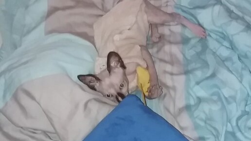 Котенок сфинкс играет с подушкой BUDI BASA