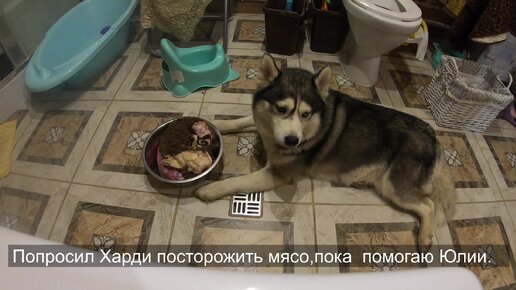 Попросил Хаски Харди посторожить миску с мясом, пока сам помогал жене.