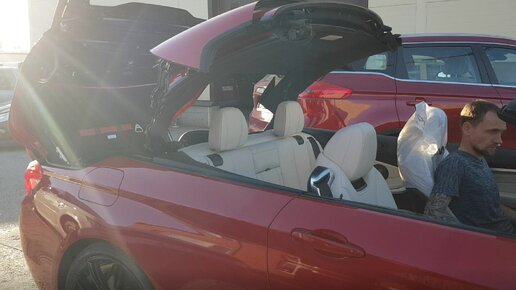 BMW кабриолет. Показываем, как одним нажатием кнопки крыша убирается за 15 секунд. Далее так же обратно закрывается.