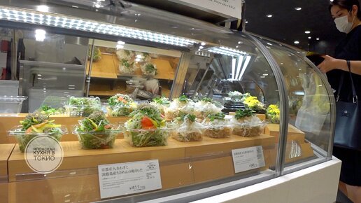 Отдел готовых блюд в японском торговом центре. Японская кухня в Токио.