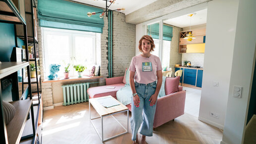 Яркая кухня-гостиная со стеклянной перегородкой, дубовым паркетом, кирпичными стенами и розовым диваном