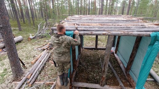 ЖУТКАЯ СТРОЙКА В ЛЕСУ. ХИЖИНА ОТШЕЛЬНИКА. КАК СТРОИТЬ ХИЖИНУ ОХОТНИКА. ПРОБЛЕМЫ СО ЗВЕРЬЁМ.