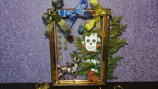Взяла рамочку, елочные игрушки и сделала красивую новогоднюю композицию
