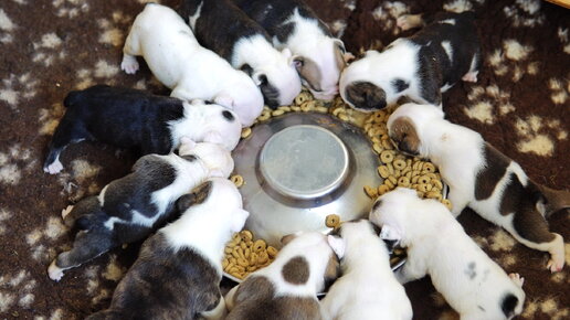 11 маленьких щенков первый раз в жизни пробуют сухой корм