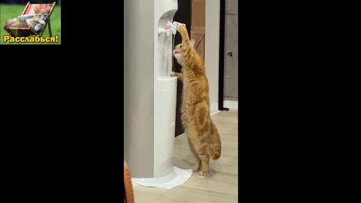 Кот пьет воду из кулера, стоя на задних лапах О_о