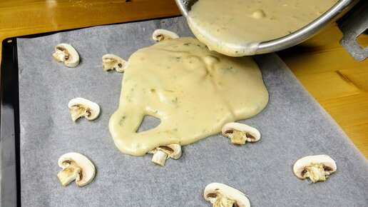 Рецепт праздничного закусочного рулета / Для основы этого рулета приклеиваю грибы к бумаге и заливаю тестом