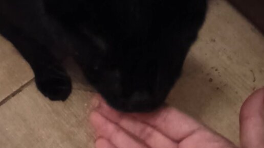 Слепой кот Малыш угощается куриным паштетом.