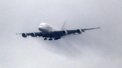 Самолет - гигант A380 вылетает из тучи. (Низкая облачность в Домодедово)