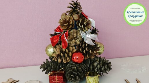 Из бобины от ниток и шишек сделала новогоднюю ёлочку для украшения рабочего стола