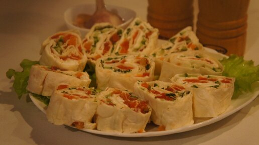 Рулетики из лаваша с красной рыбой и зеленью. Простая, легкая закуска на праздничный стол.