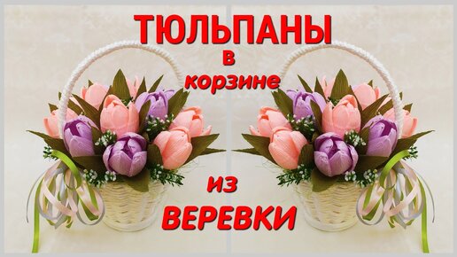 Тюльпаны в корзине из веревки. ПОДАРОК своими руками. Букет из конфет.