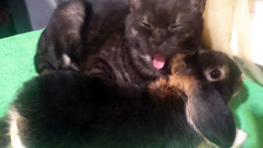 Кот забрался в клетку к кролику и отказывался из нее вылезать.