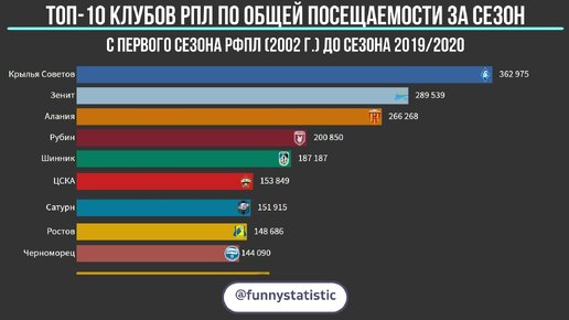 Топ-10 клубов по общей посещаемости за сезон в РПЛ (2002-2020)