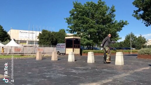Объезд столбов на моноколесе на одной ноге,задом и передом