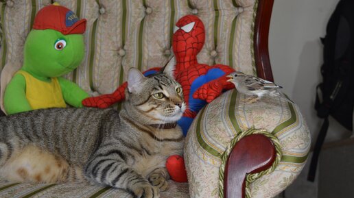 Воробей хочет играть с котом, а кот купается после прогулки