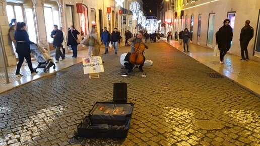 Уличный музыкант волшебно играет на виолончели в Лиссабоне