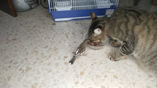 Кот приглашает воробья на обед кушать мясные консервы