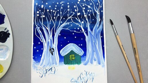 Рисуем зимний пейзаж: домик на опушке. Гуашь. Для детей от 5 лет