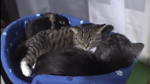 Кролик Пенёк любит спать с котами. Коты смирились...