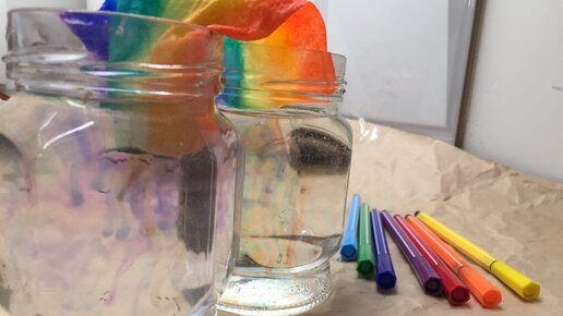 Нарисованные радуги из двух банок встречаются посередине / опыт для детей / 3+