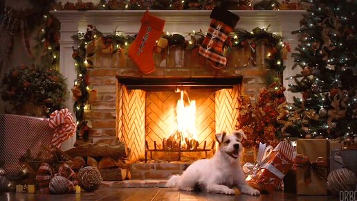 gif video Ёлка, Новогодний Камин. Собака у Новогоднего Камина. Новый 2021 Год. merry christmas