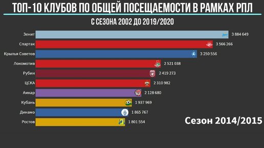 Клубы РПЛ по общей посещаемости за 18 сезонов (с сезона 2002 по 2019/2020)