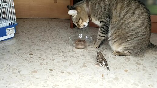Кот сначала кушает с воробьем, а потом они вместе играют