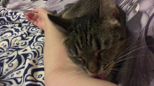Кошка вылизывает мою руку до царапин и только потом начинает умываться сама (она всё больше нас удивляет)