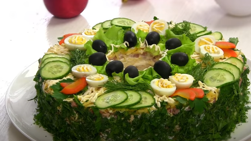 Мясной новогодний салат "Сытый Барин". Очень вкусный слоёный салат с курицей и ветчиной.