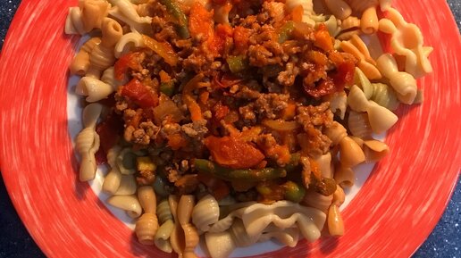 Фарш с овощами и цветными макаронами.