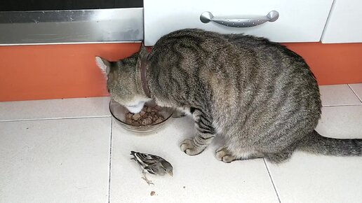 Кот и воробей едят с одной тарелки