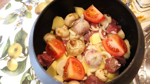 Картошка с грибами и мясом в чугунном горшке