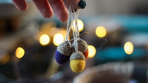 Если у вас остались шляпки от желудей, сваляйте для них шерстяные шарики)