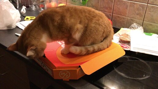 Пытается выудить кусочек пиццы