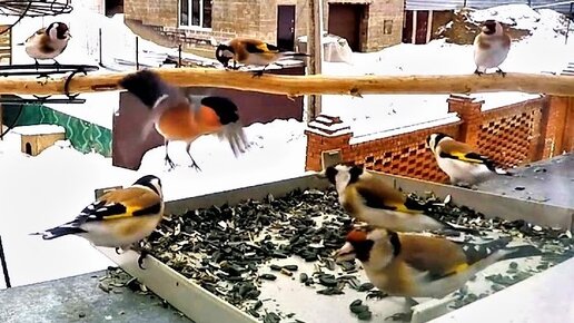 Снегирь, сговорившись с чечёткой, вытеснили от кормушки стайку щеглов.