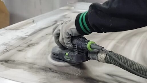Маляр выводит зашпатлеванный капот машинкой без рубанка.