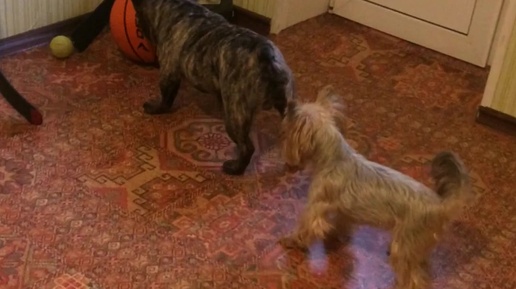 Йоркширский терьер и французский бульдог смешно играют в футбол