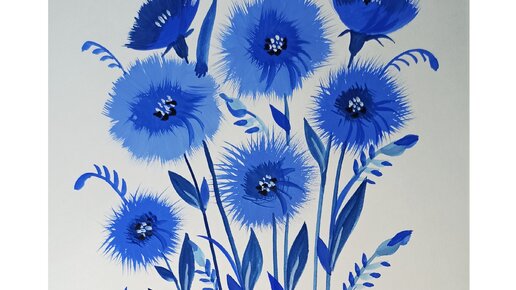 Синие цветы - рисунок гуашью (веерной и круглой кистью).