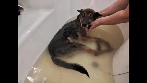 Рексик молодец: пёсику очень понравились водные процедуры!)