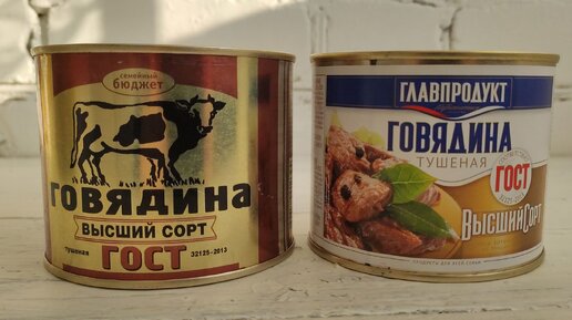 Сравнение тушенки говяжьи, Семейный бюджет ( Мценск ) 110 руб и Главпродукт ( Мценск ) 260 руб