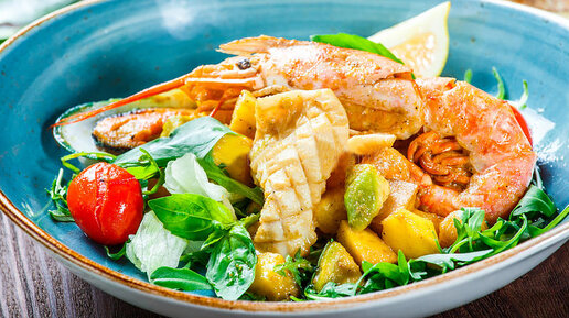 Рецепты к новогоднему столу: салат с морскими гребешками, лангустинами, страчателлой, тыквой и хурмой